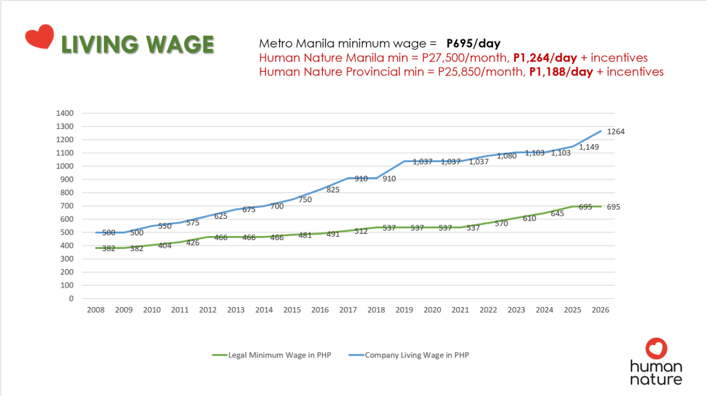 The new minimum wage will equate to Php 27,500/month (Php 1,264/day) in Metro Manila and Php 25,850/month (Php 1,188.50/day) in the provinces, positioning the company among businesses in the Philippines advocating for a living wage over the standard minimum wage.